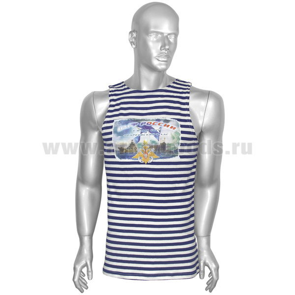 Майка-тельняшка кулирка синяя ВМФ России (С нами Бог и Андреевский  флаг) рисунок и надпись краской