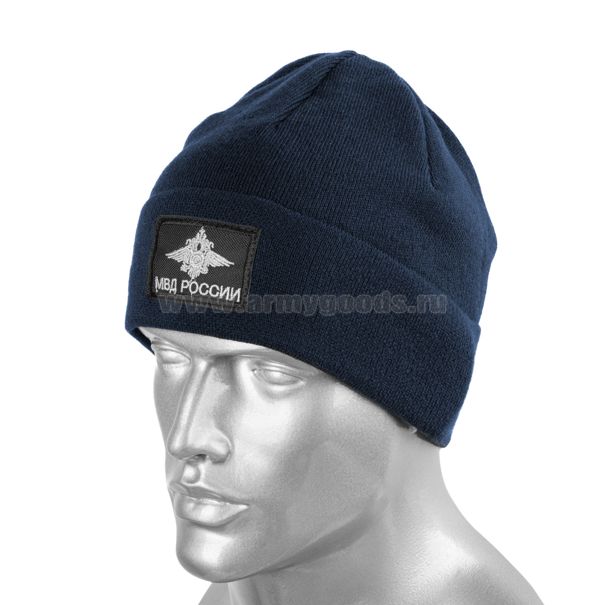 Шапка вязаная п/ш с флисовой подкладкой иссиня-черная с вышит. шевроном МВД России (орел МВД)