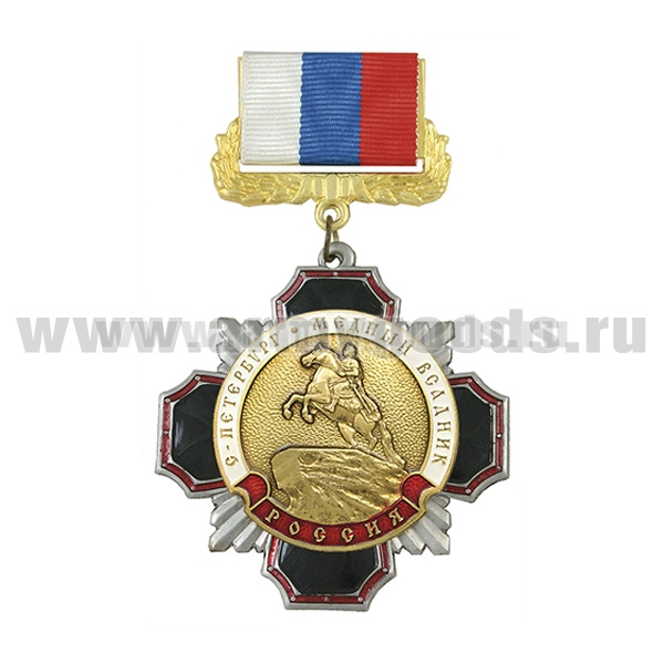 Медаль Стальной черн. крест с красн. кантом С-Петербург Медный всадник (на планке - лента РФ)