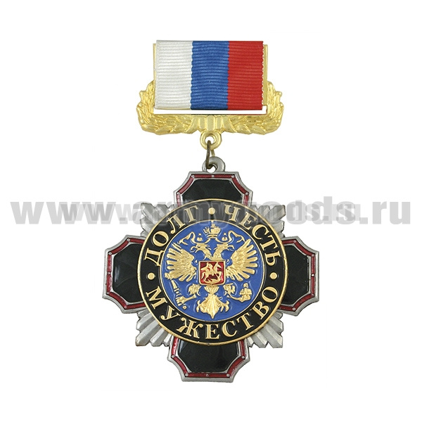 -Медаль Стальной черн. крест с красн. кантом Долг Честь Мужество (орел РФ на синем фоне (на планке - лента РФ)