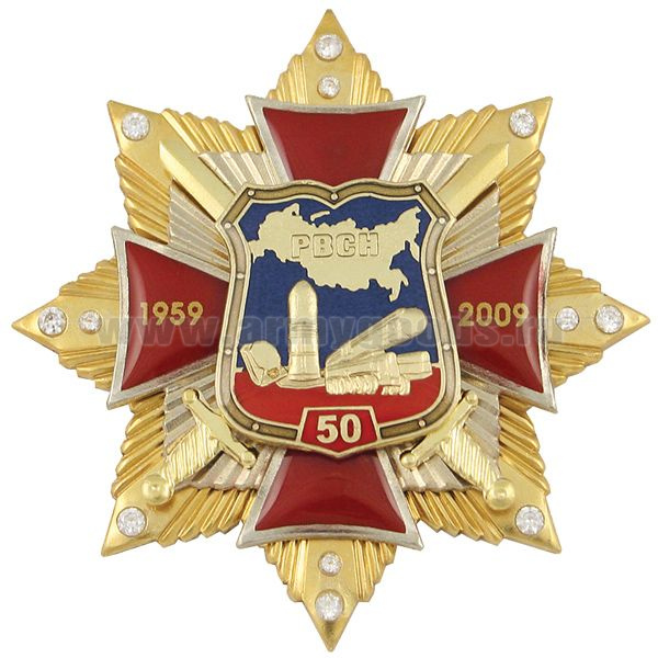 Значок мет. 50 лет РВСН 1959-2009 (красн. крест с накладками, смола, на звезде с фианитами)
