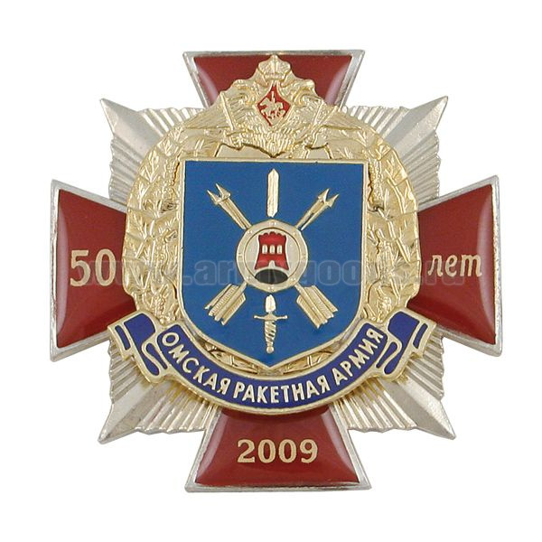 Значок мет. 50 лет Омской ракетной армии 2009 (красн. крест с накладками, смола)