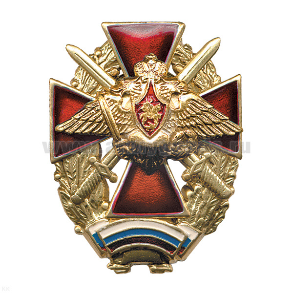 Значок мет. Мальт. крест с орлом РФ и мечами (с флагом РФ внизу) красн. с окантовкой