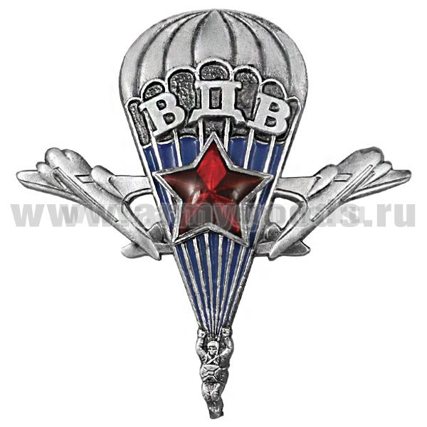 Значок мет. ВДВ (парашютист с 2 самолетами и накладной красной звездой) серебр.
