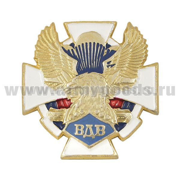 Значок мет. ВДВ (орел, крылья вверх на бел. кресте) с флагом РФ (танки, самолеты, парашюты)