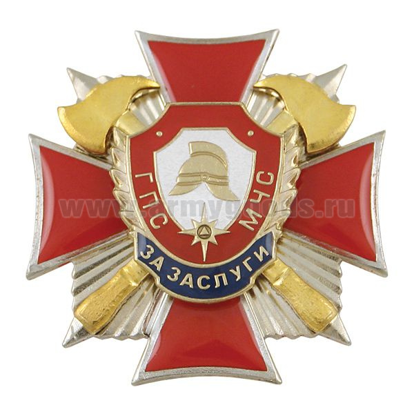 Значок мет. За заслуги ГПС МЧС (красн. крест с накл., заливка см)олой
