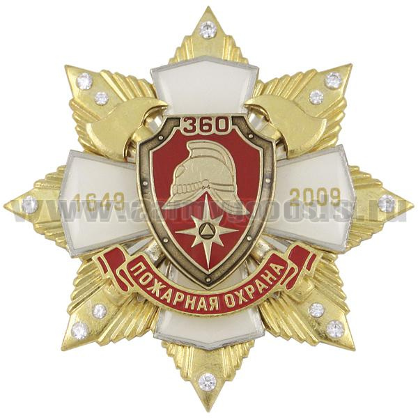 Значок мет. 360 лет пожарной охране 1649-2009 (белый крест с накл., на звезде с фианитами)