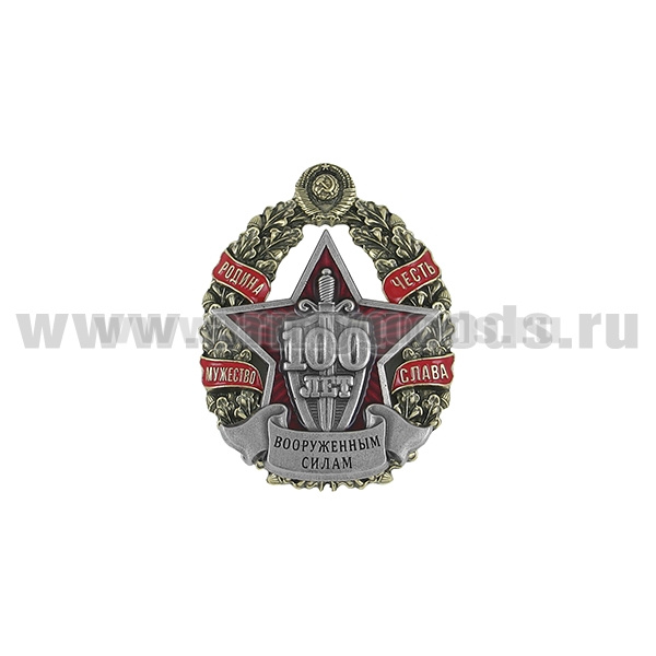 Значок мет. 100 лет Вооруженным силам (с гербом СССР) Родина Мужество Честь Слава