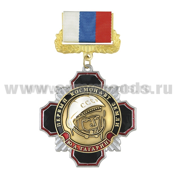 Медаль Стальной черн. крест с красн. кантом Первый космонавт Земли Гагарин Ю. А. (на планке - лента РФ)
