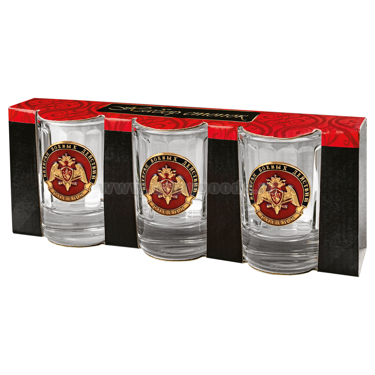 Стопки стеклянные (3x50 мл) с накладками Ветеран боевых действий (с орлом Росгвардии)