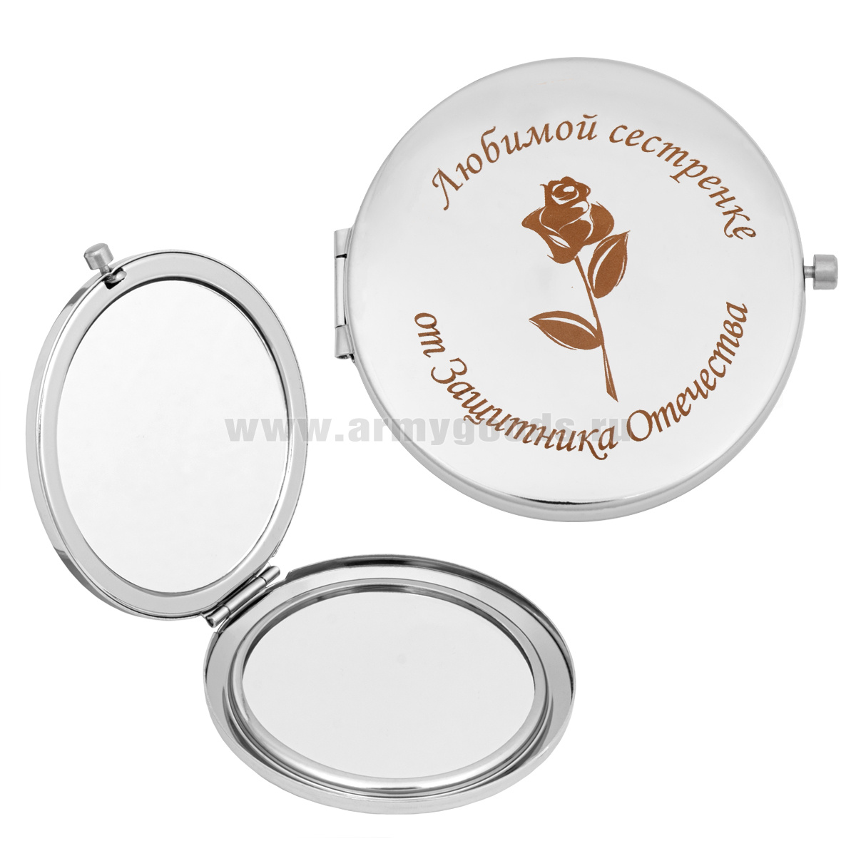 Зеркало карманное с лазерной гравировкой Любимой сестренке от Защитника Отечества