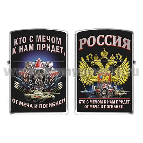 Зажигалка бензиновая цветная Кто с мечом к нам придет, от меча и погибнет (А.Невский)