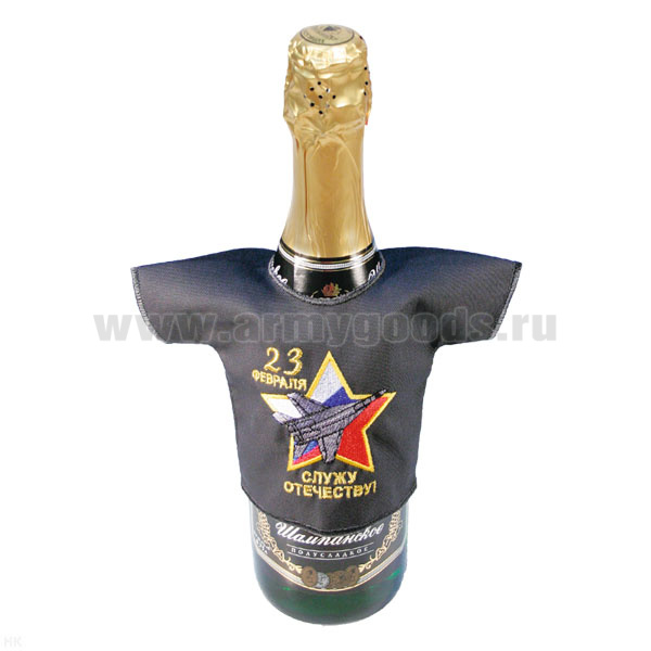 Рубашечка на бутылку сувенирная вышитая 23 февраля Служу Отечеству! (самолет) серая