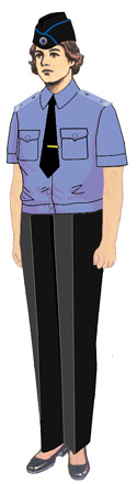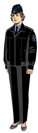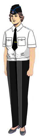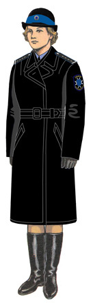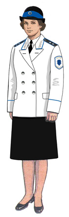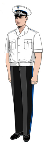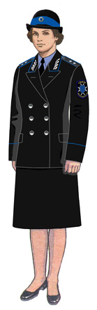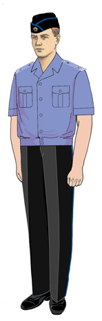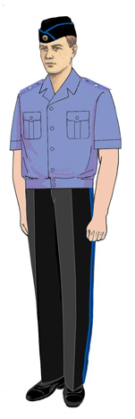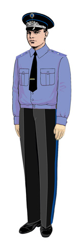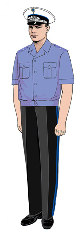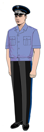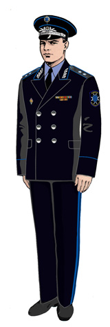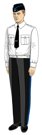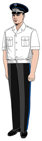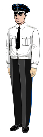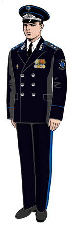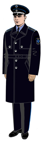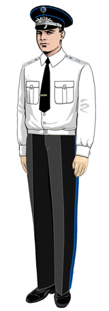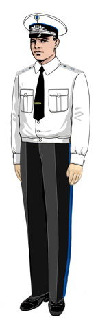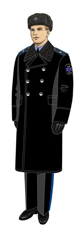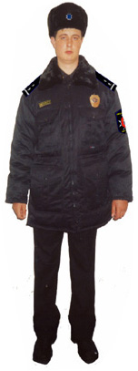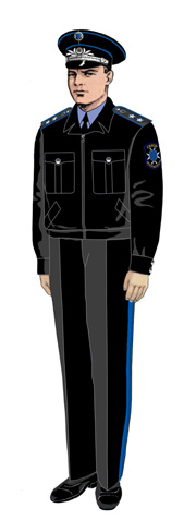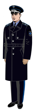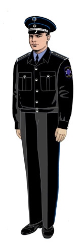Костюм специальный состоит из: куртки утепленной черного цвета с отстегивающимся воротником из искусственного меха; прямой куртки черного цвета на молнии, с планкой на поясе, отложным воротником, декоративными погончиками, нагрудными накладными карманами с клапанами серого цвета; параллельных брюк классического стиля черного цвета с синим кантом в боковых швах и со шлевками в форме трапеции под широкий ремень; рубашки черного цвета с декоративными погонами черного цвета и нагрудными карманами, с длинным или коротким рукавом; рубашки белого цвета с длинным или коротким рукавом; шапки-ушанки; фуражки европейского образца с кантами синего цвета.