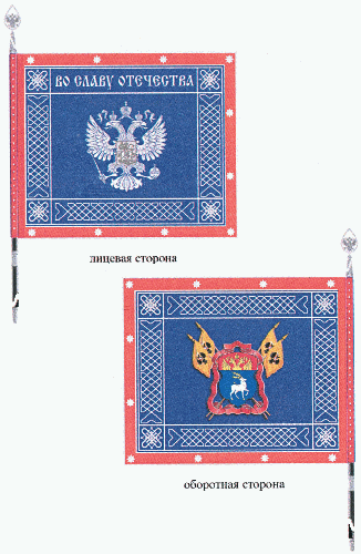 Полотнище знамени прямоугольное, синего цвета, с каймой красного цвета. Полотнище знамени и кайма обшиты серебристой тесьмой. По сторонам полотнища, в рамке, проходит серебристый плетеный орнамент. По кайме полотнища вышиты серебристые звездочки.