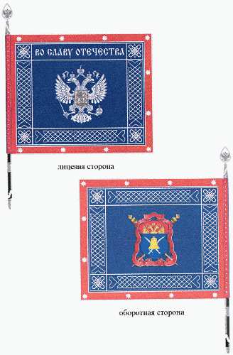 На лицевой стороне полотнища знамени, в центре, - вышито одноцветное серебристое изображение главной фигуры Государственного герба Российской Федерации: двуглавый орел, поднявший распущенные крылья. Орел увенчан двумя малыми коронами и над ними - одной большой короной, соединенными лентой. В правой лапе орла - скипетр, в левой - держава. На груди орла, в щите, - всадник в плаще, поражающий копьем опрокинутого навзничь и попранного конем дракона. В верхней части рамки надпись "ВО СЛАВУ ОТЕЧЕСТВА". Надпись выполнена серебристыми буквами, стилизованными под старославянский шрифт.