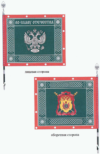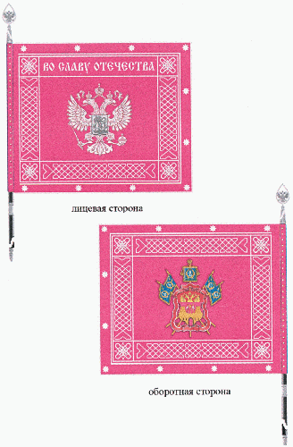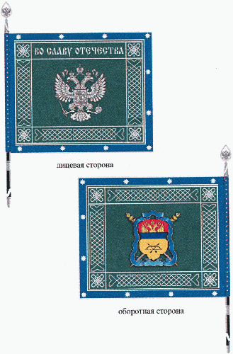 Полотнище знамени прямоугольное, зеленого цвета, с каймой красного цвета. Полотнище знамени и кайма обшиты серебристой тесьмой. По сторонам полотнища, в рамке, проходит серебристый плетеный орнамент. По кайме полотнища вышиты серебристые звездочки.