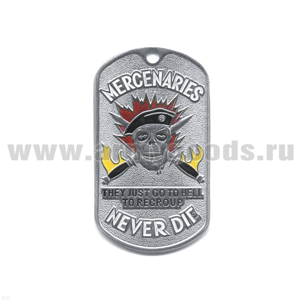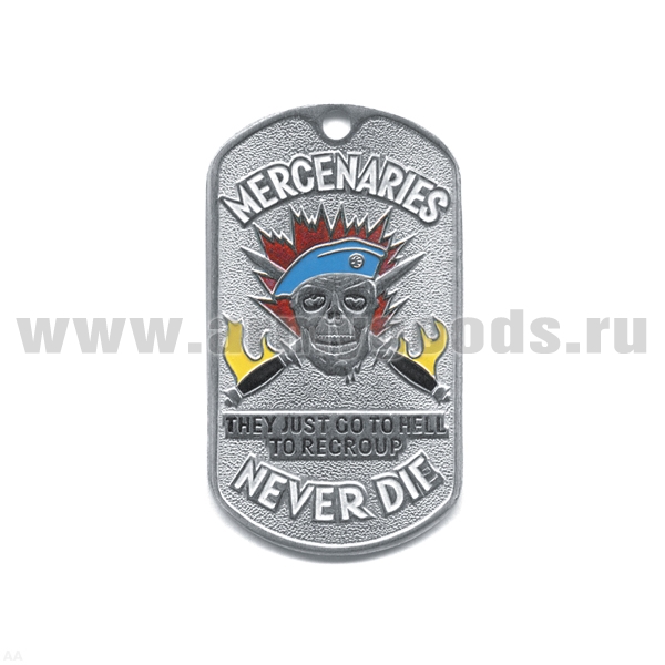 Жетон (нерж. ст., эмал.) Mercenaries never die (череп в голуб. берете)