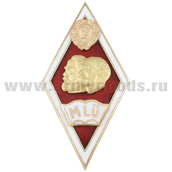 Значок мет. Университет марксизма-ленинизма (ромбик с надписью MLU на открытой книге, гербом СССР и профилями Ленина и Маркса на красном фоне)